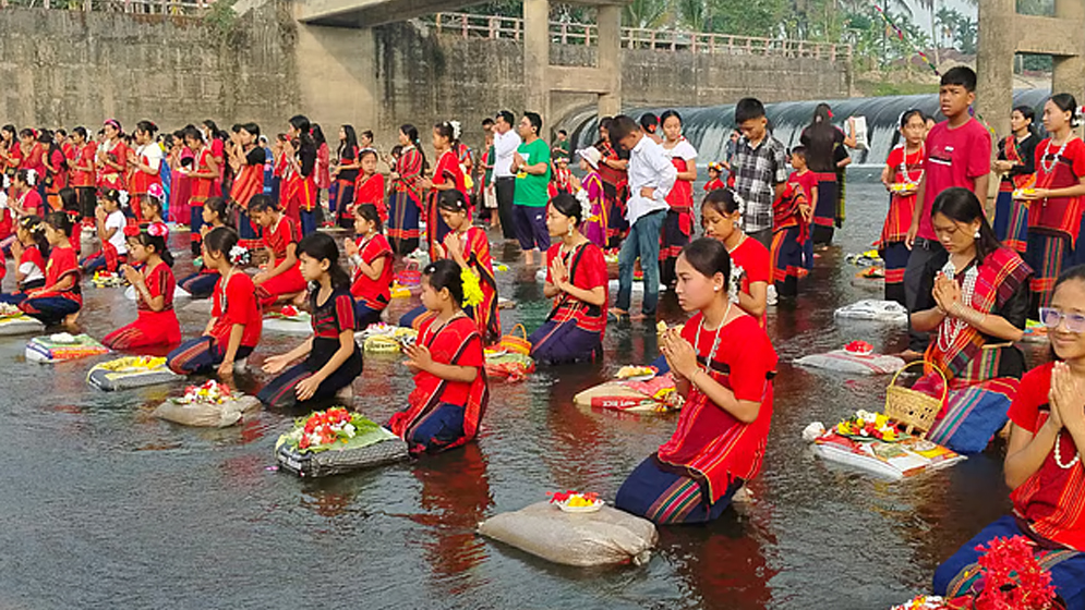 নদীতে ফুল ভাসিয়ে বিজু উৎসব শুরু, বিশ্বশান্তি কামনা