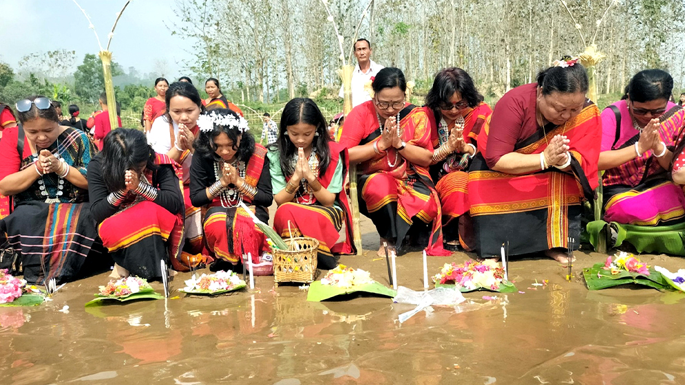 ছবি: খাগড়াছড়িতে বৈসাবি উৎসবে নদীর তীরে ফুল নিবেদন করছেন চাকমা সম্প্রদায়ের মানুষেরা