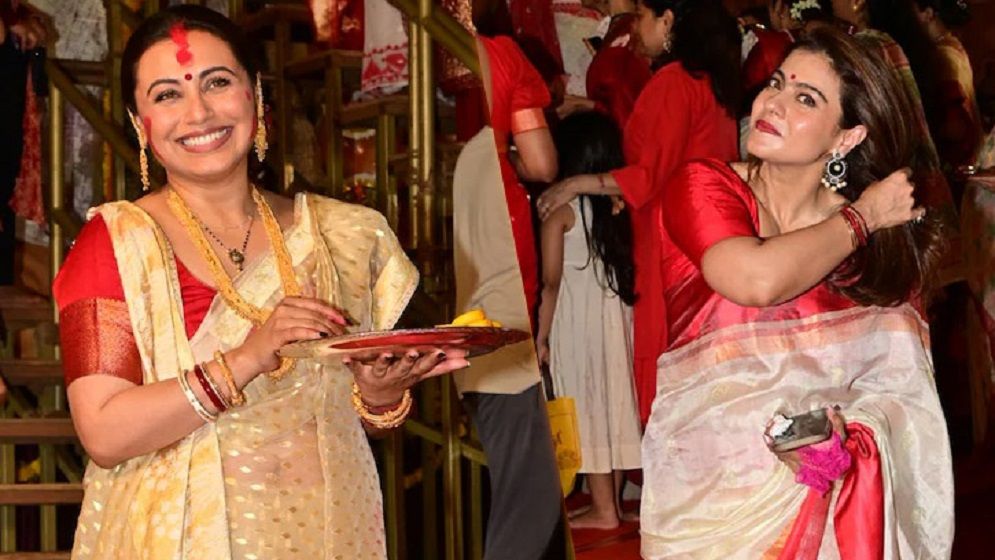 মা দুর্গাকে বরণ শেষে প্রিয়জনদের সঙ্গে সিঁদুর খেলায় মাতেন কাজল-রানী। কোলাকুলির পর্বও সারেন তারা। মুখার্জিদের সিঁদুর খেলায় যোগ দেন অভিনেত্রী শার্লিন চোপড়াও। তা ছাড়াও ছিলেন রূপালি গাঙ্গুলি, ঈশিতা দত্ত, বৎসল শেঠ প্রমুখ।