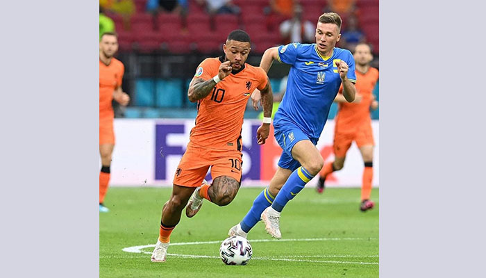 ইউক্রেনের এক খেলোয়াড়ের সঙ্গে বল দখলের লড়াইয়ে মেম্ফিস ডিপাই।