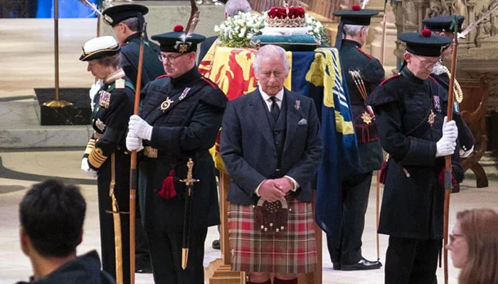 বোন প্রিন্সেস অ্যান ও ভাই প্রিন্স অ্যান্ড্রু ও এডওয়ার্ডসহ মা রানি দ্বিতীয় এলিজাবেথের কফিনে শ্রদ্ধা জানান চার্লস ফিলিপ আর্থার জর্জ।