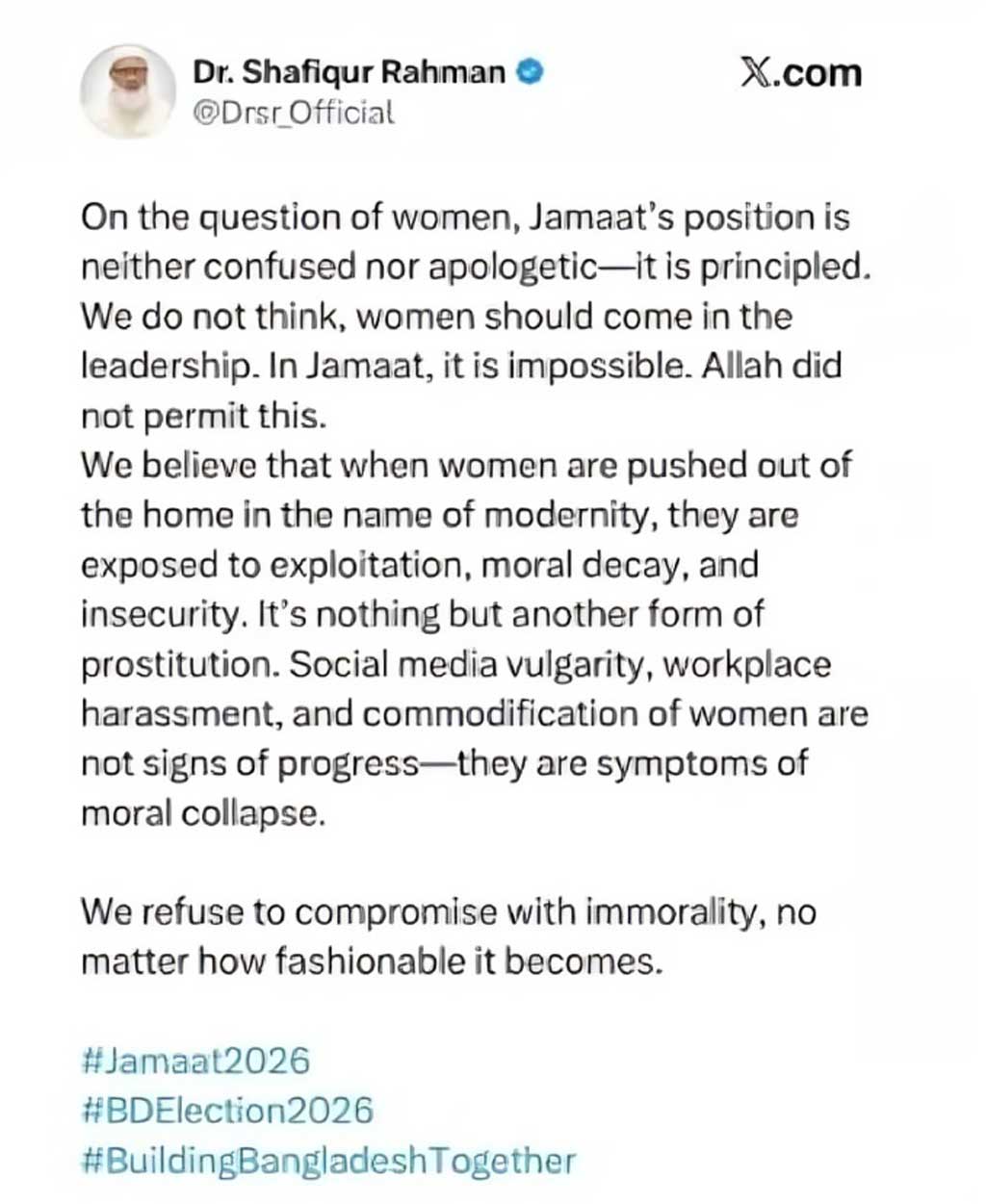 শফিকুর রহমানের এক্স হ্যান্ডেল থেকে প্রকাশিত একটি পোস্ট শনিবার সামাজিক যোগাযোগমাধ্যমে ছড়িয়ে পড়ে। সেখানে জামায়াতে ইসলামে নারী নেতৃত্ব এবং কর্মজীবী নারীদের বিষয়ে দেওয়া বক্তব্য নিয়ে তীব্র সমালোচনা শুরু হয়।