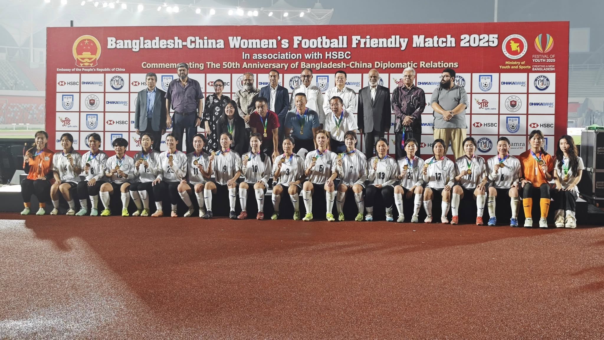 বাংলাদেশ ও চীনের মধ্যে বন্ধুত্বপূর্ণ কূটনৈতিক সম্পর্কের ৫০ বছর উদযাপন উপলক্ষে ঢাকায় অনুষ্ঠিত হয় নারীদের প্রীতি ফুটবল ম্যাচ। ছবি: সিজিটিএন